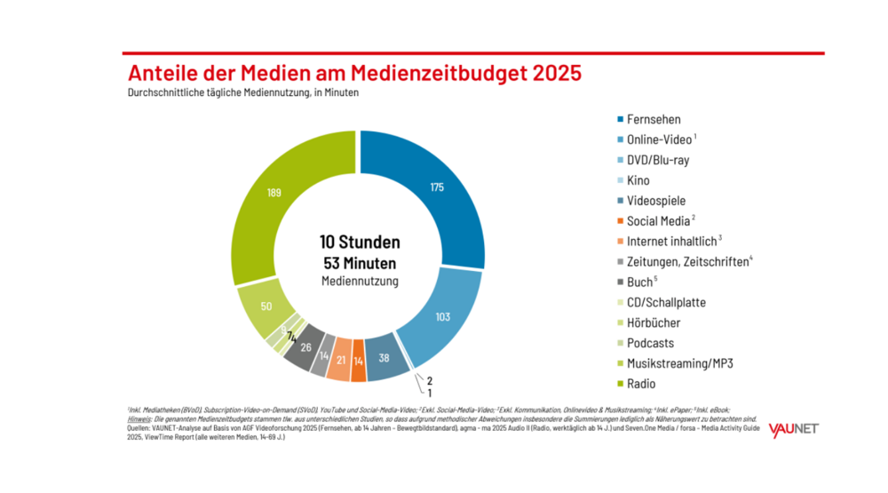 Die VAUNET-Mediennutzungsanalyse beruht auf einer kontinuierlichen Auswertung von Sekundärquellen, darunter Daten der Arbeitsgemeinschaft Media-Analyse (agma), der Verbrauchs- und Medienanalyse (VuMA, seit Ende 2025 eingestellt), der Arbeitsgemeinschaft Videoforschung (AGF) und des Media Activity Guides sowie dem ViewTime Report von Seven.One Media und forsa. Die medienübergreifenden Angaben zur täglichen Mediennutzungsdauer stammen aus unterschiedlichen Quellen, sodass aufgrund methodischer Unterschiede insbesondere die Summierung lediglich als Näherungswert zu betrachten ist. Die Angaben zur täglichen Mediennutzung im Gattungsvergleich ergeben sich aus Werten der agma zur Radio- und Audionutzung (Hörer:innen ab 14 Jahren), der AGF Videoforschung für die TV-Nutzung (Zuschauer:innen ab 14 Jahren) sowie des Media Activity Guides und dem ViewTime Report von SevenOne Media und forsa zur Nutzung der übrigen Medien (Nutzer:innen 14-69 Jahre). Die Angaben zur Gesamtreichweite von Fernsehen und Radio basieren auf dem Weitesten Seher:innen- bzw. Hörer:innenkreis und sind auf einen Zeitraum von zwei bzw. vier Wochen bezogen.