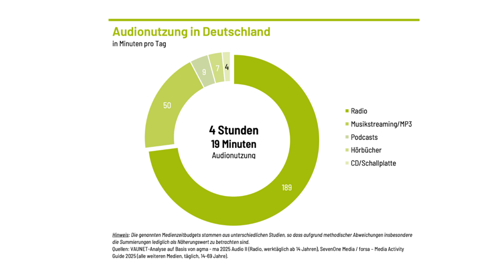 Die durchschnittliche tägliche Audionutzung lag im Jahr 2025 hochgerechnet bei insgesamt 4 Stunden und 19 Minuten und stieg damit im Vergleich zum Vorjahr um 6 Minuten (2024: 4 Std. und 13 Min.). Hiervon entfiel mit 3 Stunden und 9 Minuten weiterhin der Großteil der Audionutzung auf das werktägliche Radiohören (Vorjahr: 3 Std. und 3 Min.). Der restliche Audiokonsum entfiel hauptsächlich auf die Nutzung von Online-Audio-Inhalten: 50 Minuten auf das Musikstreaming (2024: 49 Min.) und 9 Minuten auf Podcasts (2024: 10 Min.).