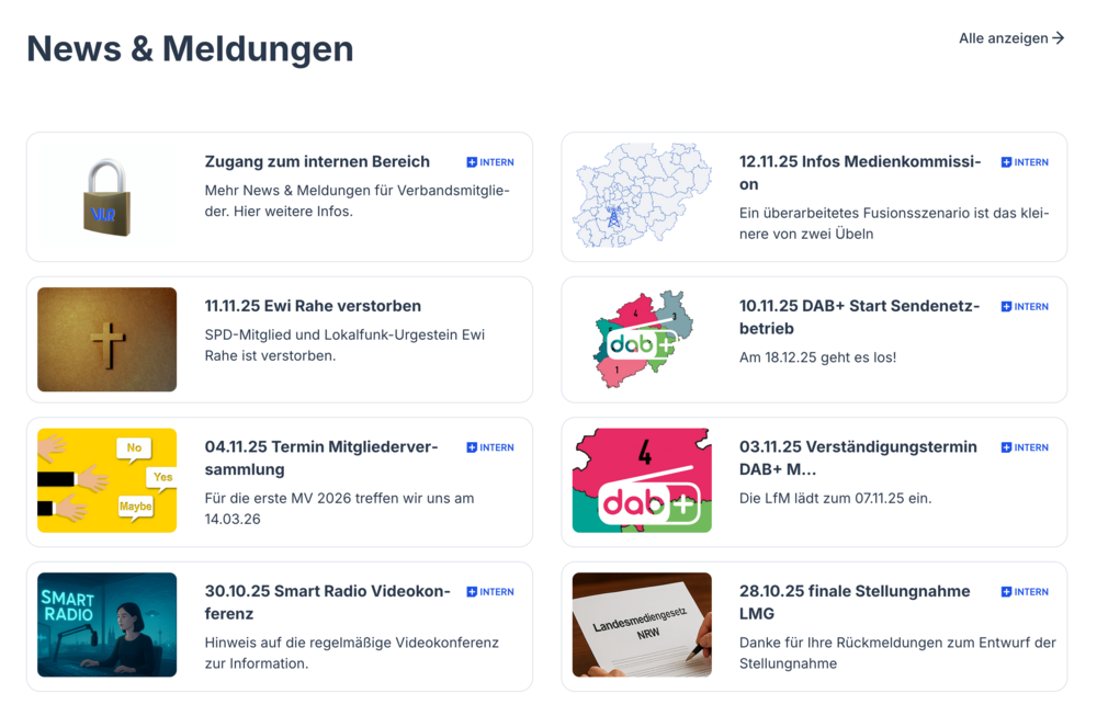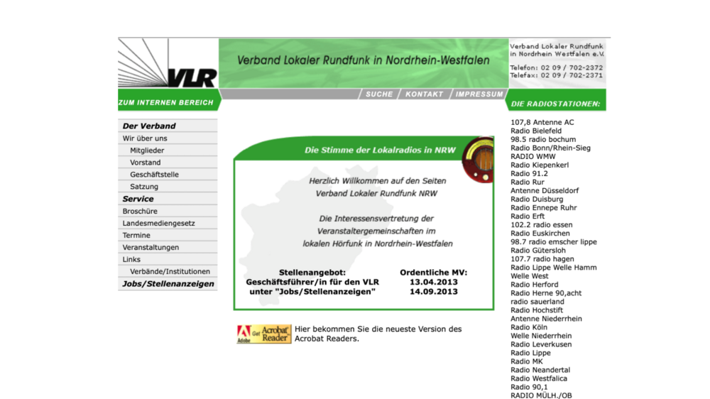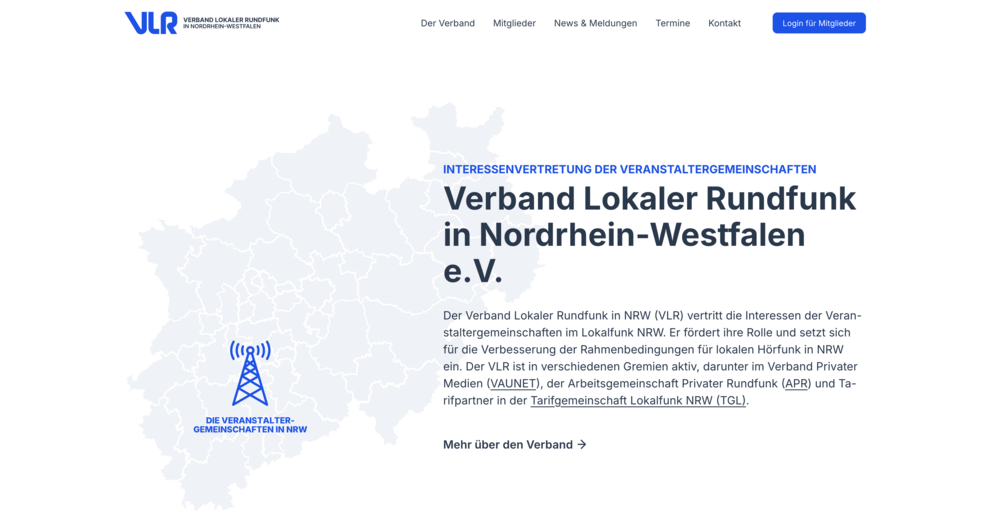 Eine weitere Anforderung war, dass die Webseite ansprechend Informationen rund um den Lokalfunk in NRW, die Mitglieder des Verbandes und die Verbandsarbeit darstellen können soll. Mitglieder des Verbandes sollen darüber hinausgehende interne und vertrauliche Informationen und Downloads erhalten können, ohne in die Tiefen der Webseite vorstoßen zu müssen. Auf Basis des Content Management Systems NEOS wurde dann die nun bestehende Webseite errichtet. Angemeldete Nutzer profitieren sofort nach dem Login von einer erweiterten Darstellung mit zahlreichen internen Inhalten und Links zu Downloads und weitergehenden Informationen.