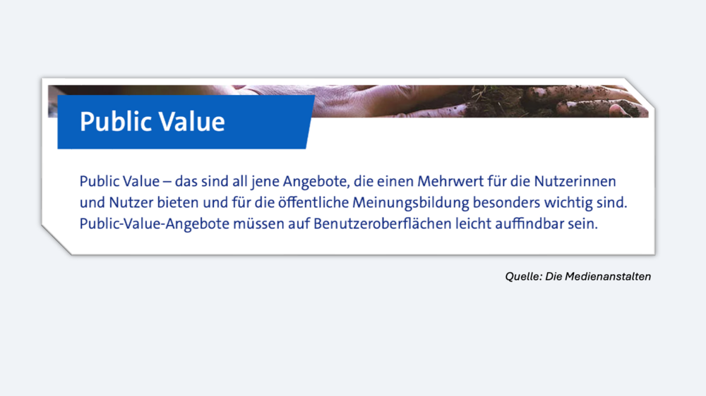 Die Medienanstalten beschreiben Public Value als Angebote, die einen Mehrwert für die Nutzerinnen und Nutzer bieten und für die öffentliche Meinungsbildung besonders wichtig sind. Public-Value-Angebote müssen auf Benutzeroberflächen besonders leicht auffindbar sein.